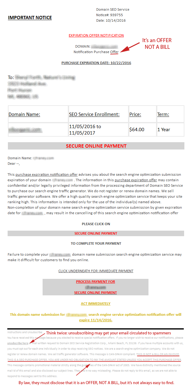 Domain Registry of America got a bad name for the way they sent offers that looked like bills and tricked domain owners into paying a company they’d never done business with for the renewal of their domain. Yes, they would transfer your domain to their account and pay to renew it for a year but, the point is, you did not intend to change registrars or make a conscious decision to work with them. Well, there’s a new kid on the block…a company selling SEO using a similar strategy but with a few new twists. Click here to take a look at the offer sent to one of our subscribers by email. If you should get one of these, you may find that the domain on the bill/offer may be for a domain that is not even owned by you, but that is available for registration. The top of the notice/invoice simply says Domain SEO Service and the email being sent to domain owners includes a link to submit payment online… but payment to whom? The identity of the company trying to obtain your business and wanting to you to enter your credit card is never disclosed anywhere in the email. Because we manage domains for a great many of our customers, we have received a great many of these emails for different domains and, therefore, can see that each email has been sent from a different random address as well. If you manage your own domain, we wanted to make you aware of this scam in case you receive similar emails.